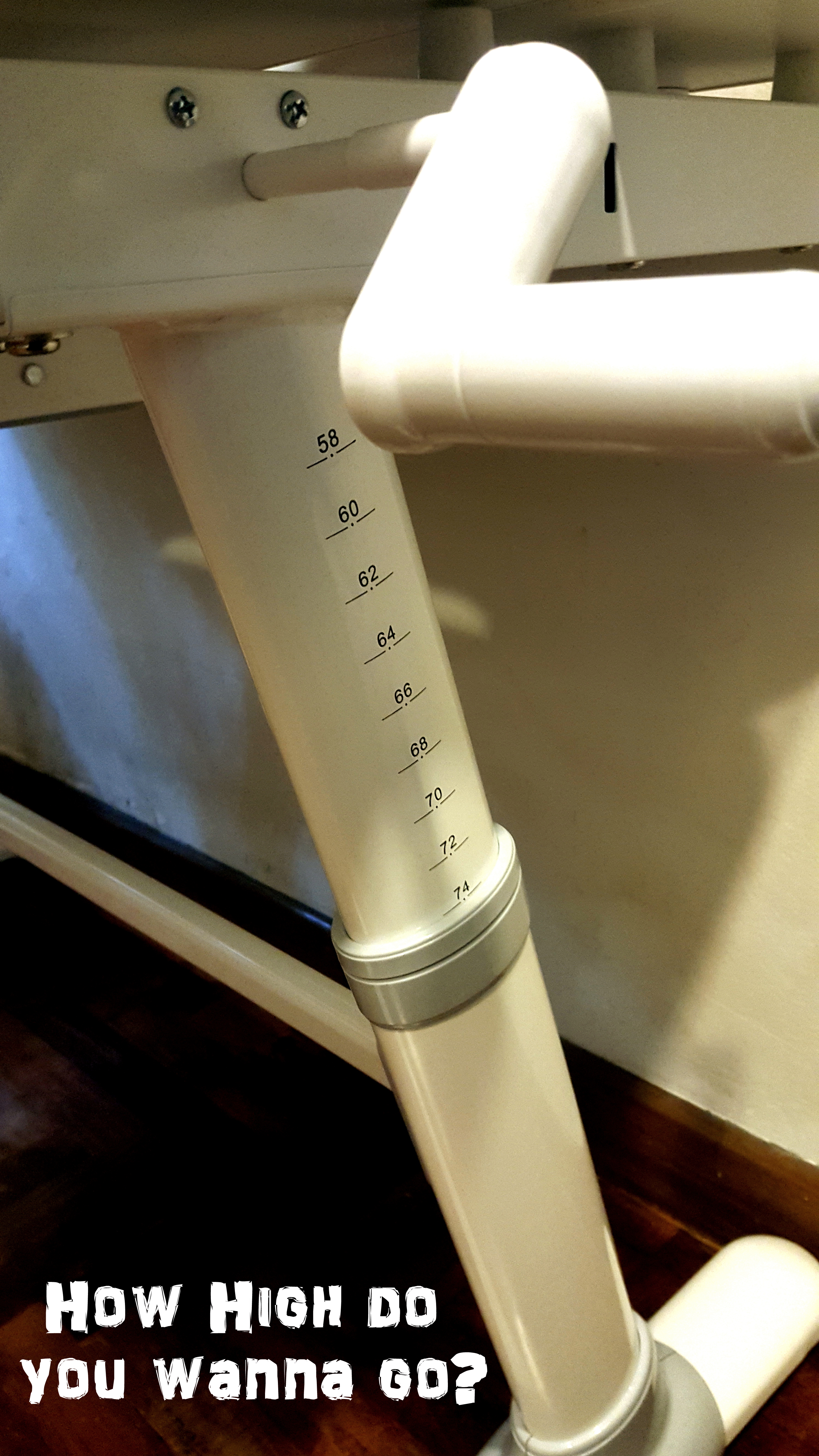 The table has a lever which is easy to use. I mean it’s so easy to use, my 8 yr old can do it. Look at Meimei adjusting the table after her sister used it. The table can be adjusted from 58cm to 80cm, dependent on each individual’s height.